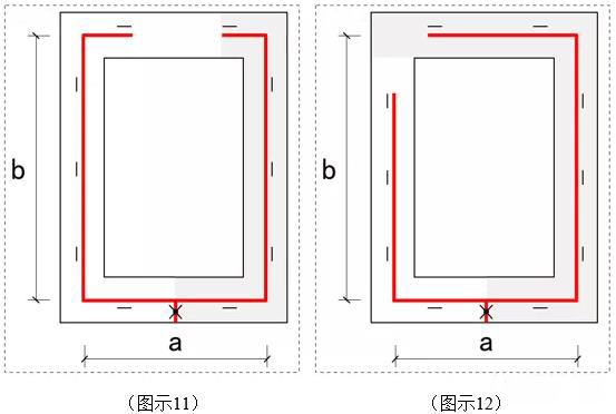 3、結(jié)論:由圖示可知,對(duì)于口形走道,依風(fēng)管設(shè)置方式不同,原則2的計(jì)算長(zhǎng)度可能大于原則1,在圖示11中,防煙分區(qū)的長(zhǎng)邊長(zhǎng)度為a+b,在圖示12中,防煙分區(qū)的長(zhǎng)邊長(zhǎng)度為1.5a+b,在圖示13中,防煙分區(qū)的長(zhǎng)邊長(zhǎng)度為2a+2b(這是最不利的極限情況,相當(dāng)于第一章觀(guān)點(diǎn)1的計(jì)算長(zhǎng)度)。