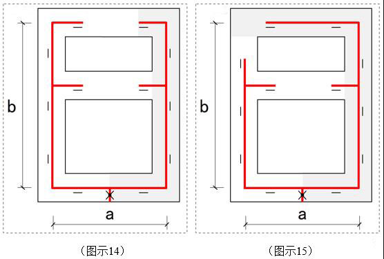 日形走道的計(jì)算方式和原則,與口形走道相同,示例中,圖示14的防煙分區(qū)長(zhǎng)邊長(zhǎng)度為a+b,在圖示15的防煙分區(qū)長(zhǎng)邊長(zhǎng)度為1.5a+b。