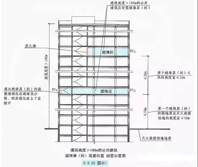 注意:避難層的第一個50m是從滅火救援場地地面到第一個避難層地面,以上避難層均為地面到地面的距離差。