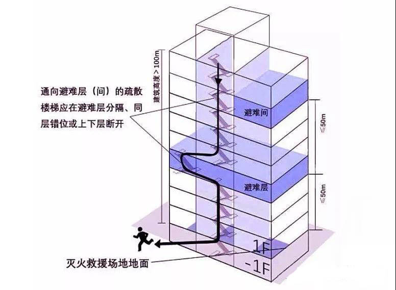 避難層應(yīng)至少有兩個不同的疏散方向可供疏散,通向避難層的疏散樓梯應(yīng)在避難層分隔、同層錯位或上下層斷開。