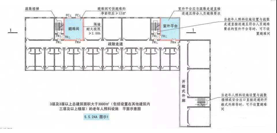 當(dāng)老年人照料設(shè)施設(shè)置與疏散樓梯或安全出口直接連通的開敞式外廊、與疏散走道直接連通且符合人員避難要求的室外平臺時,可不設(shè)置避難間。