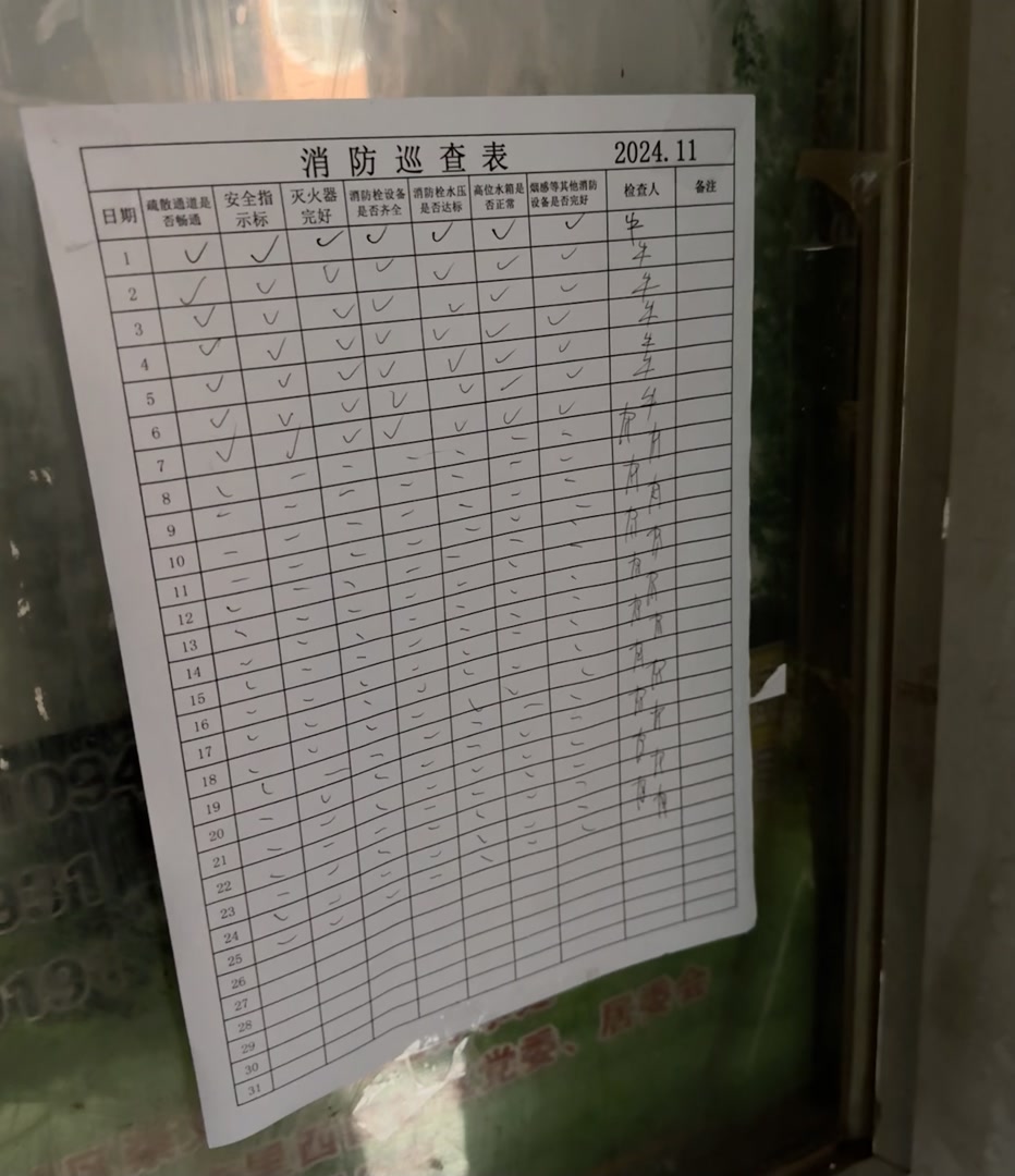 既然真實存在疏散通道被堵占的問題,為何張貼在單元門口的消防巡查表卻在“疏散通道是否暢通”一欄全打了對鉤?上述物業(yè)公司負責人支支吾吾,無法作出合理解釋。左志軍認為該物業(yè)公司未如實記錄防火檢查情況,“我們已責令其限期改正,如果逾期未改正,我們將依法處罰。”