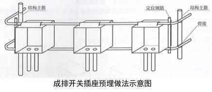 2、成排開關插座盒安裝:根據(jù)結構500mm線和結構墻面線,確定成排線盒的高度及位置,墻內(nèi)主筋上做標記,上下用兩根鋼筋穿接線盒,兩側加短鋼筋與結構立筋焊接定位,盒口與模板面平齊,固定端正牢靠,間距均勻。