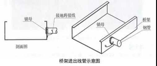 3、橋架進出線管:根據(jù)出線口位置,在橋架側面開孔,一管一孔。管端套5~6扣絲,與橋架連接內(nèi)外側采用鎖母固定,管口伸入橋架內(nèi)不大于5mm,導管與橋架采用不小于4mm²的軟銅線接地跨接。