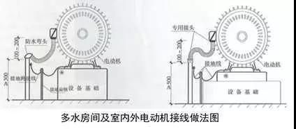 1、電源配管連接:根據(jù)電動機接線盒位置敷設電源管,成排電動機接線盒宜同向排列。電源敷設在靠近接線盒的方向,管口離地高度宜≥300mm,低于電動機接線盒中心100~200mm,室外電源管高度與接線盒中心一致,管口安裝防水彎頭。在距管口50~100mm處焊接接地螺栓。軟管管徑應與電源管同徑,軟管應留有適當余量,兩端采用專用管接頭盒專用盒接頭連接。導線壓倒接線盒內(nèi)的接線端子上。電動機底座、電源管應與接地母線可靠連接。