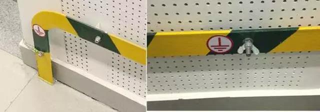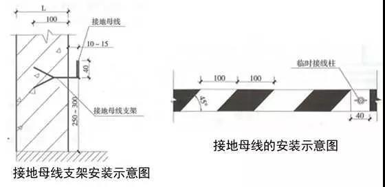 2、配電室接地母線:用扁鋼制作接地母線支架,支架末端加工成燕尾形,埋設深度不小于50mm,出墻平直長度為10~15mm,上彎立面長度為40mm。支架安裝間距為1m,離地面高度為300mm。接地母線應先調直或煨彎后焊接在支架上,接地母線搭接長度大于等于扁鋼寬度的2倍且三面施焊。每房間設不小于2處的蝴蝶螺母作為臨時接線柱,過門處暗敷埋設,轉角用扁鐵煨制圓弧形,煨彎半徑R≥100mm,穿墻板處加設套管保護。接地母線應刷45°斜向黃綠相間標識油漆,條紋間距100mm,臨時接線柱兩側各留20mm寬度不刷漆。