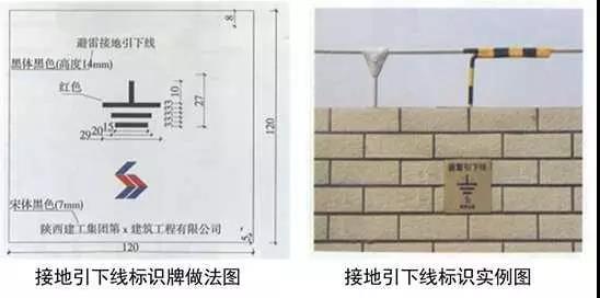 1、避雷接地測試點:預埋扁鐵鋼及100x100x50線盒,線盒與墻面平齊,鍍鋅扁鋼鉆φ12孔,安裝防松墊片及蝴蝶螺母,螺母居預埋盒中心。編織軟銅線一端連接在蝴蝶螺母上,另一端壓接銅鼻子用于接地測試。銅質面板用螺絲固定在預埋盒上,在測試點正上方50mm處粘貼銅質或不銹鋼標識牌,標識牌應標明接地測試地點、接地符號、施工單位、編號,標高尺寸及位置與相鄰沉降觀測點及標識牌一致。