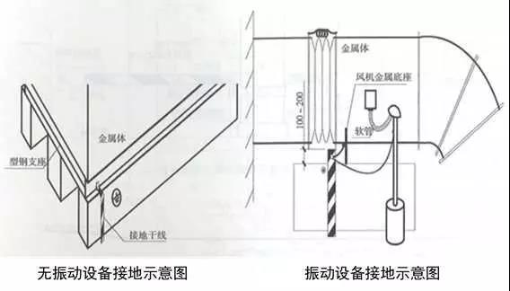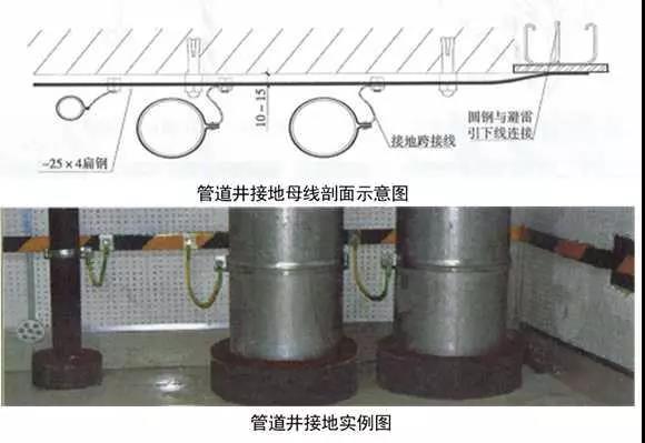 7、高層建筑管道頂部和底部接地:有接地預埋鋼板或垂直接地母線上引接接地母線,接地母線距地300~500mm,距墻10~15mm,并間隔100mm刷45°斜向黃綠相間油漆。將于管徑相匹配的接地抱箍安裝于管道上,抱箍必須與金屬體緊密接觸,編織軟銅線一端與抱箍連接,另一端與接地母線連接,螺栓連接處應加平墊片和彈簧墊片。DN≥100mm時,采用10mm²編織軟銅線,DN≤80mm時,采用4mm²編織軟銅線。
