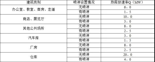 各類(lèi)場(chǎng)所的火災(zāi)熱釋放速率可按本標(biāo)準(zhǔn)第4.6.10條的規(guī)定計(jì)算且不應(yīng)小于表4.6.7規(guī)定的值。設(shè)置自動(dòng)噴水滅火系統(tǒng)(簡(jiǎn)稱(chēng)噴淋)的場(chǎng)所,其室內(nèi)凈高大于8m時(shí),應(yīng)按無(wú)噴淋場(chǎng)所對(duì)待。