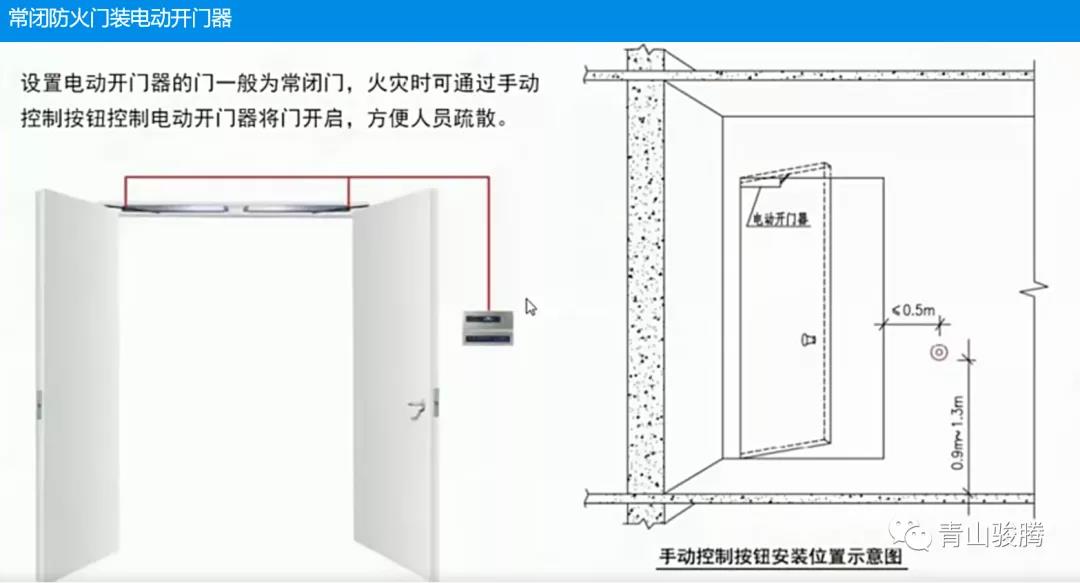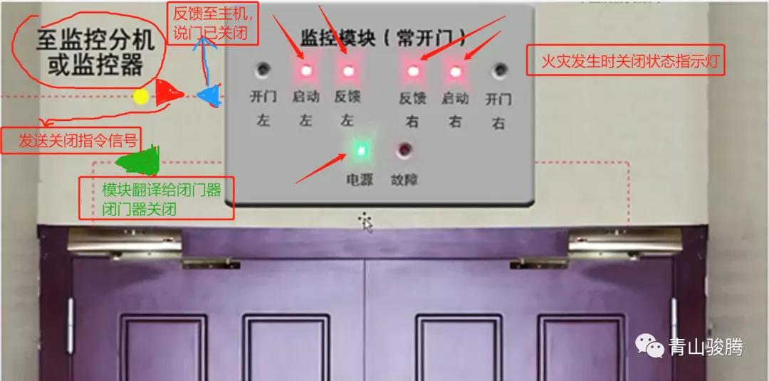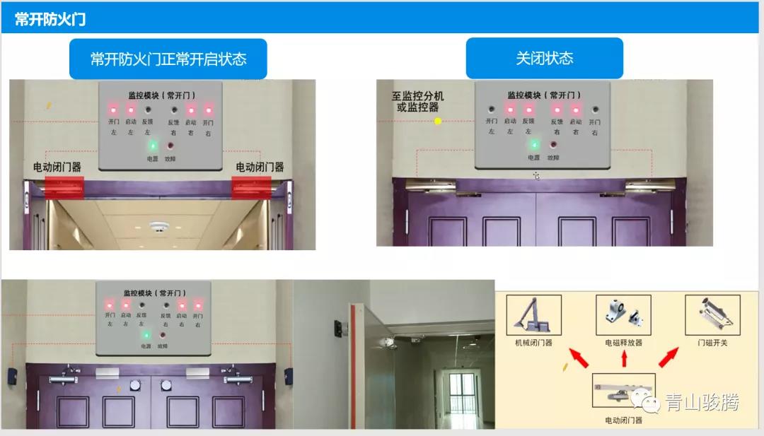 常開式防火門由防火門釋放開關(guān)控制,電動(dòng)式的。而常閉式防火門不需要設(shè)置電動(dòng)自動(dòng)控制,主要用閉門器,順序器進(jìn)行關(guān)閉,即機(jī)械式的。有的常閉防火門僅僅裝一個(gè)機(jī)械閉門器,我目前住的小區(qū)就是這種設(shè)計(jì),而有的現(xiàn)場設(shè)計(jì)常閉防火門帶一個(gè)模塊,通過門磁開關(guān)接通與否,來反饋給防火門分/主機(jī)處于的開(閉)狀態(tài),只連接一個(gè)信號(hào)線。