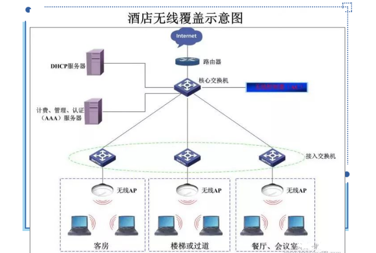 無線覆蓋系統(tǒng)的組成一般為前端無線AP、交換機、AC控制器、路由器或者防火墻。