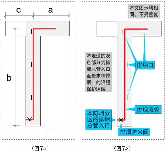 圖示13中,右側(cè)排煙風(fēng)管所保護(hù)走道的最大走道長(zhǎng)度L2=2a+2b,大于原則1的計(jì)算長(zhǎng)度。