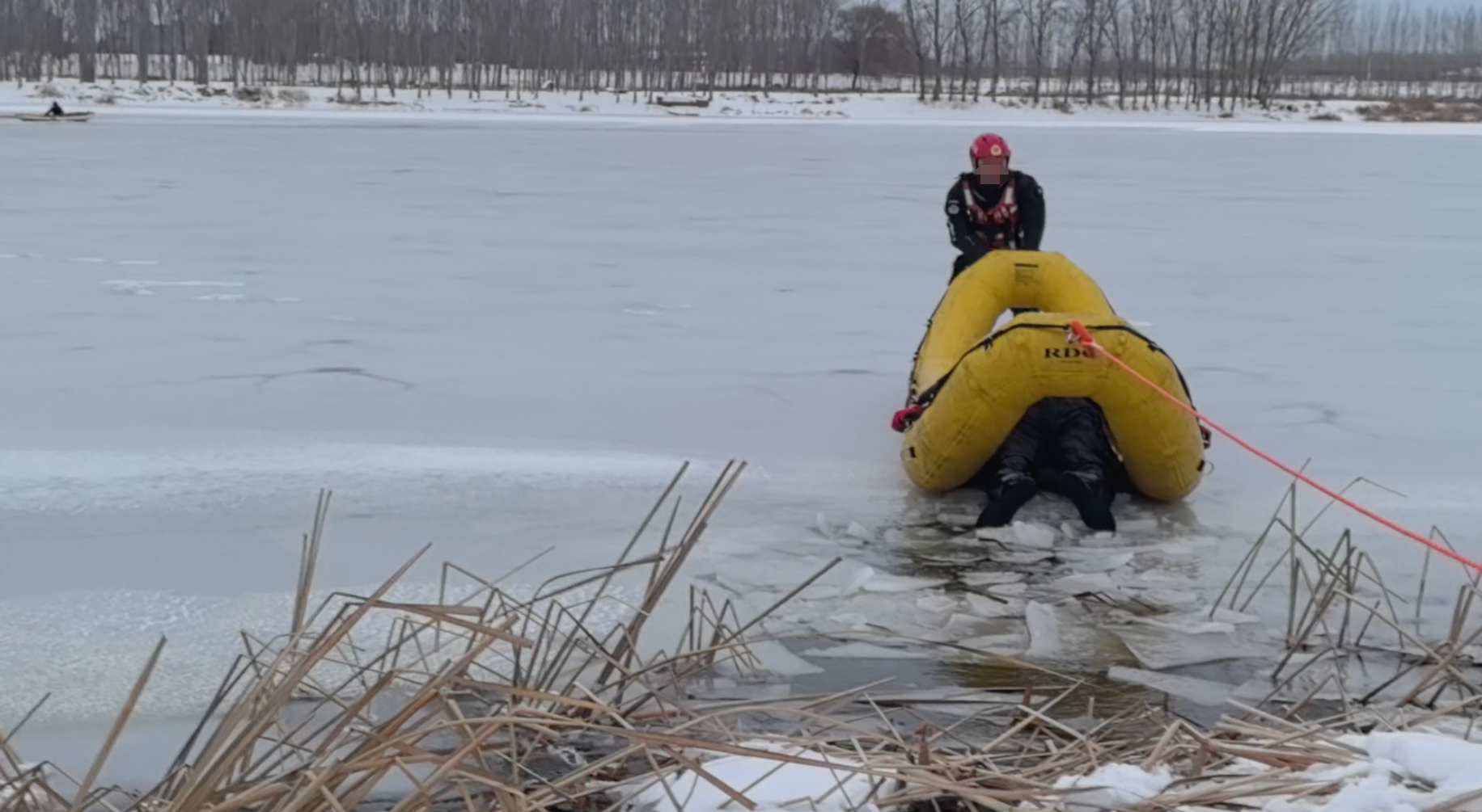 勘查完現(xiàn)場(chǎng)情況后,消防救援人員發(fā)現(xiàn),雖然氣溫低,但河面的冰并未凍結(jié)實(shí),只有薄薄一層。消防救援人員決定利用冰面救生筏以及繩索救人:兩名消防員攜帶救生筏逐步靠近被困男子,其他消防員在岸上利用繩索牽引保護(hù)。