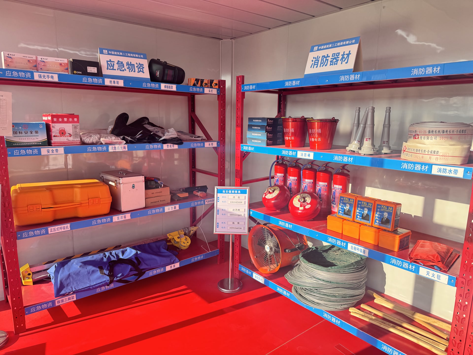 此外,微型消防站還配備了消防水帶、高壓水槍,滅火時可直接接入建設項目臨時消防水管網(wǎng),確保水源穩(wěn)定充足。而消防斧、應急照明燈、應急逃生繩、救援三腳架、擔架、防墜器等破拆與疏散器材,可滿足火情處置中的破障、救援、轉(zhuǎn)移等需求。