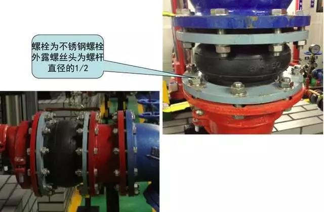 3、水泵吸水、出水變徑管安裝質量控制要點:水泵吸水口安裝上平偏心大小頭,出水口安裝同心大小頭,螺栓外露長度不大于螺桿直徑的1/2,且長度一致。