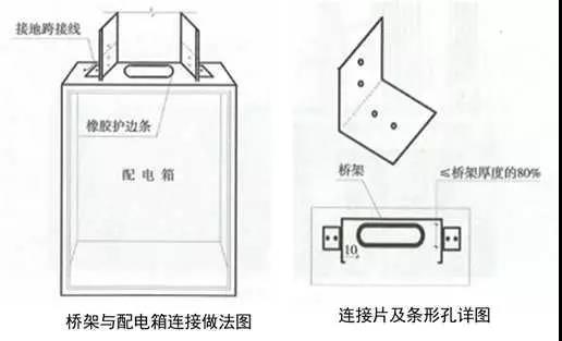 3、橋架與配電箱的連接:配電箱頂部劃線、鉆孔,用電鋸開條形孔,清理孔邊沿毛刺,孔兩端為弧形,兩端尺寸小于橋架寬度10mm左右,厚度小于等于橋架厚度的80%,孔中心與橋架中心對應,開孔處補漆,孔周邊粘貼橡膠條護口。箱體與橋架用1~1.5mm厚、90°的橋架連接片連接,連接螺栓絲頭朝外,加設專用墊片,刃面朝向橋架連接片,螺栓外露2~3扣絲。橋架與箱體采用4mm²黃綠雙色多股軟銅線或編織軟銅線接地跨接。