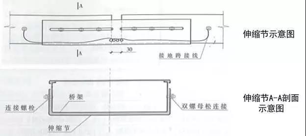 4、伸縮節(jié)安裝:當橋架經(jīng)過建筑伸縮縫或橋架直線長度大于30m(鋁合金及其他材料直線段長度大于15m)時,應設置伸縮節(jié),伸縮節(jié)應設置在伸縮縫位置或直線長度的中間。伸縮節(jié)兩側各設置一個支架,支架與伸縮節(jié)端部距離不大于500mm。伸縮節(jié)補償收縮襯板應設在伸縮節(jié)外側,襯板螺栓孔應開成條形孔,襯板長度為兩個連接板長度之和加30mm,雙螺母應位于橋架外側,且不能擰緊,以保證自由伸縮。伸縮節(jié)兩端橋架應采用軟銅線做接地跨接,接地線中間應留有余量。
