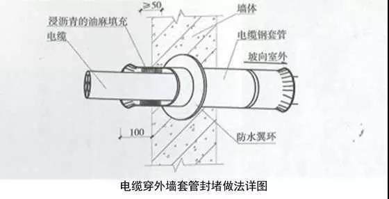 2、電源管穿外墻做法:在穿外墻位置敷設套管,宜內(nèi)高外低并設止水翼環(huán),管徑為電纜外徑的2倍,長度為每邊出墻面100mm。有散水時應伸出散水外邊沿100mm,套管兩端制作喇叭口,內(nèi)壁刷防銹漆,外壁出墻刷瀝青漆。電纜穿入套管后,兩端嵌入瀝青麻絲,瀝青麻絲在套管內(nèi)填充密實,距管口深度大于50mm,并應使電纜在套管內(nèi)居中。
