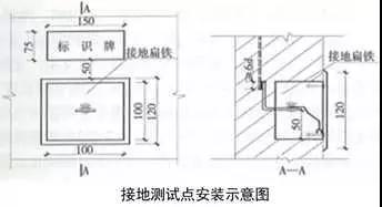 1、避雷接地測試點:預埋扁鐵鋼及100x100x50線盒,線盒與墻面平齊,鍍鋅扁鋼鉆φ12孔,安裝防松墊片及蝴蝶螺母,螺母居預埋盒中心。編織軟銅線一端連接在蝴蝶螺母上,另一端壓接銅鼻子用于接地測試。銅質面板用螺絲固定在預埋盒上,在測試點正上方50mm處粘貼銅質或不銹鋼標識牌,標識牌應標明接地測試地點、接地符號、施工單位、編號,標高尺寸及位置與相鄰沉降觀測點及標識牌一致。