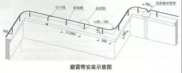 3、圓鋼避雷帶敷設:按設計位置彈線、定位,一般情況下,避雷帶應居女兒墻(屋脊)中心,當女兒墻寬度大于300mm時,支架布設于距外沿150mm處,距變形縫、轉彎300mm處設支架,直線段支架均勻分布,間距不大于1m;支架埋深不小于80mm,出女兒墻頂面不小于150mm,調整、校正支架的垂直度,根部套不銹鋼裝飾圈并用耐候膠密封固定。圓鋼調直后敷設在支架上,轉彎、搭接、變形縫處圓鋼煨彎加工,轉彎處煨彎半徑為80~100mm,搭接處一端鋼筋煨乙字彎,與另一端圓鋼上下搭接,搭接長度為100mm,搭接點宜設在離支架不小于200mm位置處,雙面施焊,焊縫連接飽滿,焊渣清理干凈,焊接點應先刷防銹漆,再刷銀粉漆,防腐處理到位;變形縫處鋼筋煨成向下半圓形。將防雷引下線可靠焊接在避雷帶上。拉通線校正避雷帶的高度、平直度。