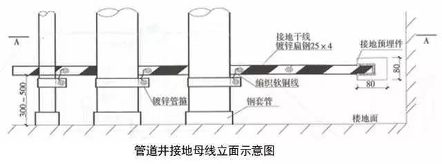 7、高層建筑管道頂部和底部接地:有接地預埋鋼板或垂直接地母線上引接接地母線,接地母線距地300~500mm,距墻10~15mm,并間隔100mm刷45°斜向黃綠相間油漆。將于管徑相匹配的接地抱箍安裝于管道上,抱箍必須與金屬體緊密接觸,編織軟銅線一端與抱箍連接,另一端與接地母線連接,螺栓連接處應加平墊片和彈簧墊片。DN≥100mm時,采用10mm²編織軟銅線,DN≤80mm時,采用4mm²編織軟銅線。