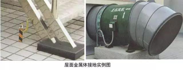 6、屋面金屬體接地:用-25x4的鍍鋅扁鋼從就近的避雷網(wǎng)引接地線,接地扁鋼一端與避雷網(wǎng)連接,另一端在金屬體附近地面引出,應高于設備基礎100~200mm。無振動設備在金屬體上直接焊接,有震動設備和非碳鋼金屬體應用編織軟銅線兩端壓端子跨接,編織軟銅線外套黃綠雙色熱縮套且熱縮。伸出地面的接地母線應刷黃綠相間油漆。體積較大的金屬體應做不小于2處的接地,高度高于避雷網(wǎng)時,應加避雷針保護。接地母線附近應做接地標識。