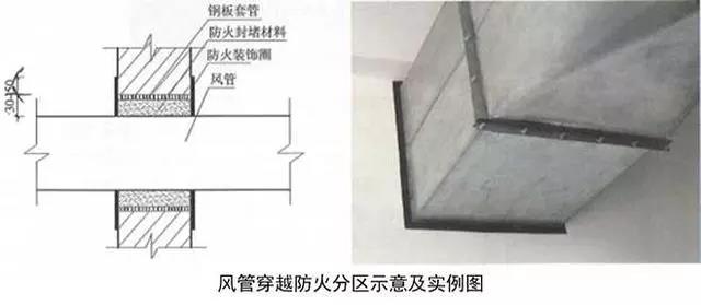 2、風管穿越防火分區(qū)做法:用2mm厚鋼板加工制作風管套管,套管接縫應滿焊,套管尺寸比風管四周尺寸大30~50mm,套管長度與墻面厚度一致。安裝完后用防火材料將套管與風管間隙填塞密實。用2mm厚、30~50mm寬黑色橡膠裝飾圈收口,裝飾圈角部45°拼接。風管穿越防火分區(qū)處必須設防火閥,防火閥距墻分隔墻間距不大于200mm,風管長邊大于630mm時,宜在防火閥兩側設單支吊架。