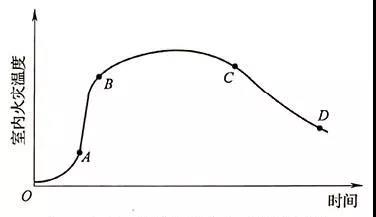 當(dāng)發(fā)生火災(zāi)的房間溫度達(dá)到一定值(圖中的B點(diǎn))時(shí),聚積在房間內(nèi)的可燃物分解產(chǎn)生的可燃?xì)怏w突然起火,整個(gè)房間都充滿(mǎn)了火焰,房間內(nèi)所有可燃物表面部分都卷入火災(zāi)之中,使火災(zāi)轉(zhuǎn)化為一種極為猛烈的燃燒,即產(chǎn)生了轟燃。