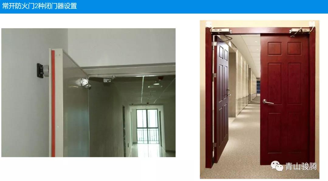 常開式防火門由防火門釋放開關(guān)控制,電動(dòng)式的。而常閉式防火門不需要設(shè)置電動(dòng)自動(dòng)控制,主要用閉門器,順序器進(jìn)行關(guān)閉,即機(jī)械式的。有的常閉防火門僅僅裝一個(gè)機(jī)械閉門器,我目前住的小區(qū)就是這種設(shè)計(jì),而有的現(xiàn)場設(shè)計(jì)常閉防火門帶一個(gè)模塊,通過門磁開關(guān)接通與否,來反饋給防火門分/主機(jī)處于的開(閉)狀態(tài),只連接一個(gè)信號(hào)線。